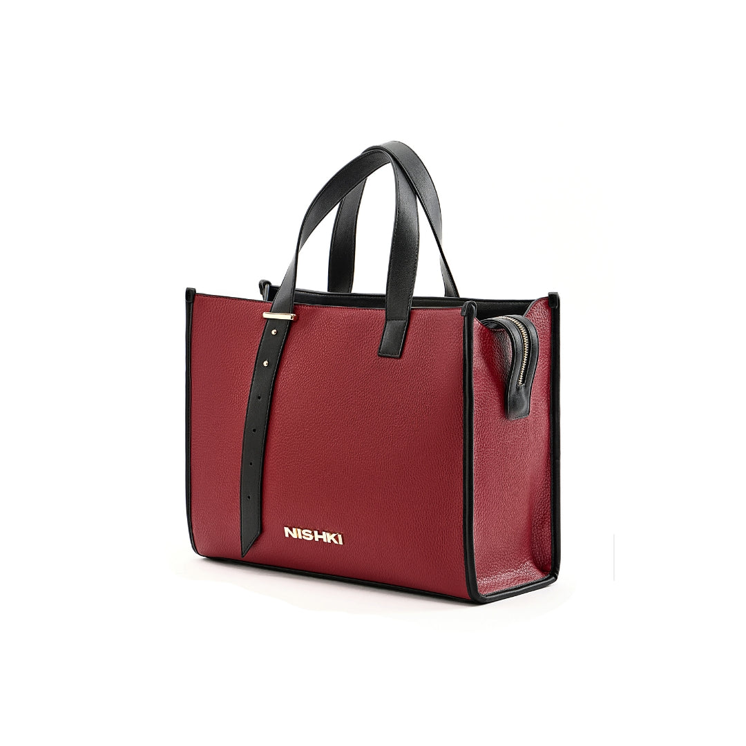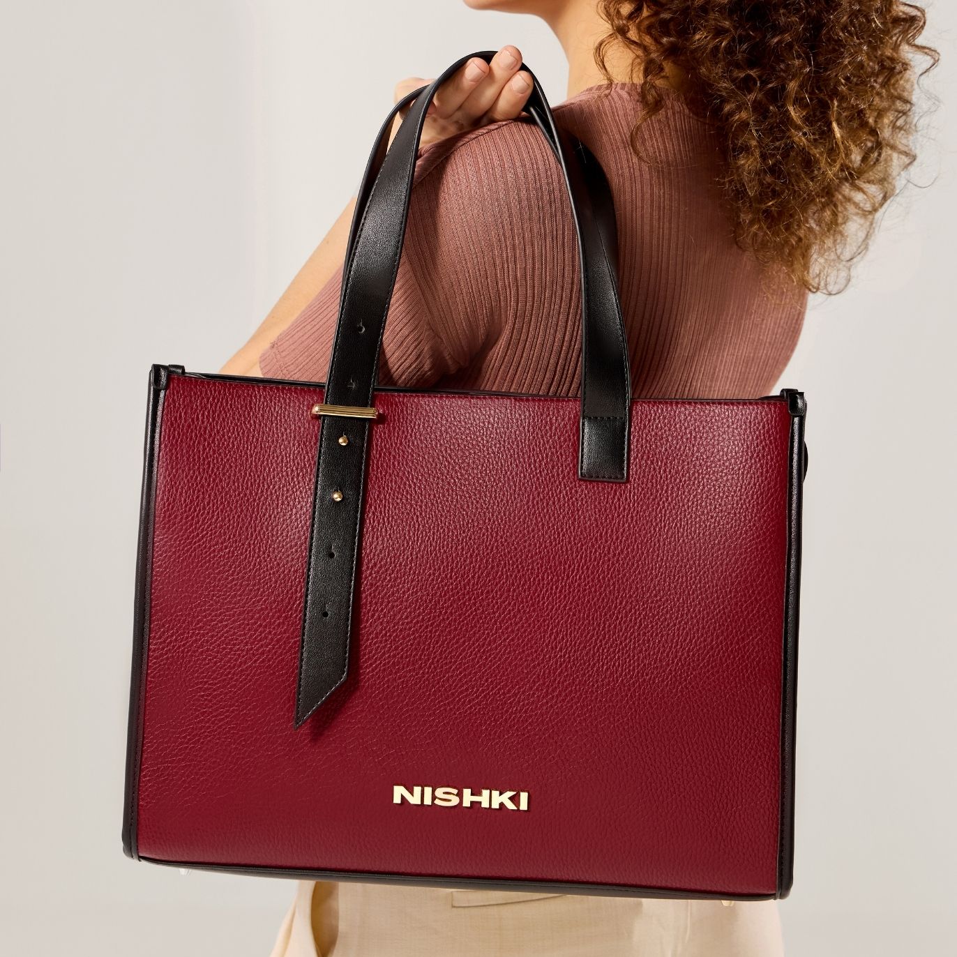 Crafted in premium faux leather with a smooth matte finish and sharp black piping, it features Nishkis signature adjustable handles so you can switch from hand-carry to shoulder-carry in seconds. The bold zipper seals it shut. And inside? Chaos stays out, thanks to cleverly designed compartments.